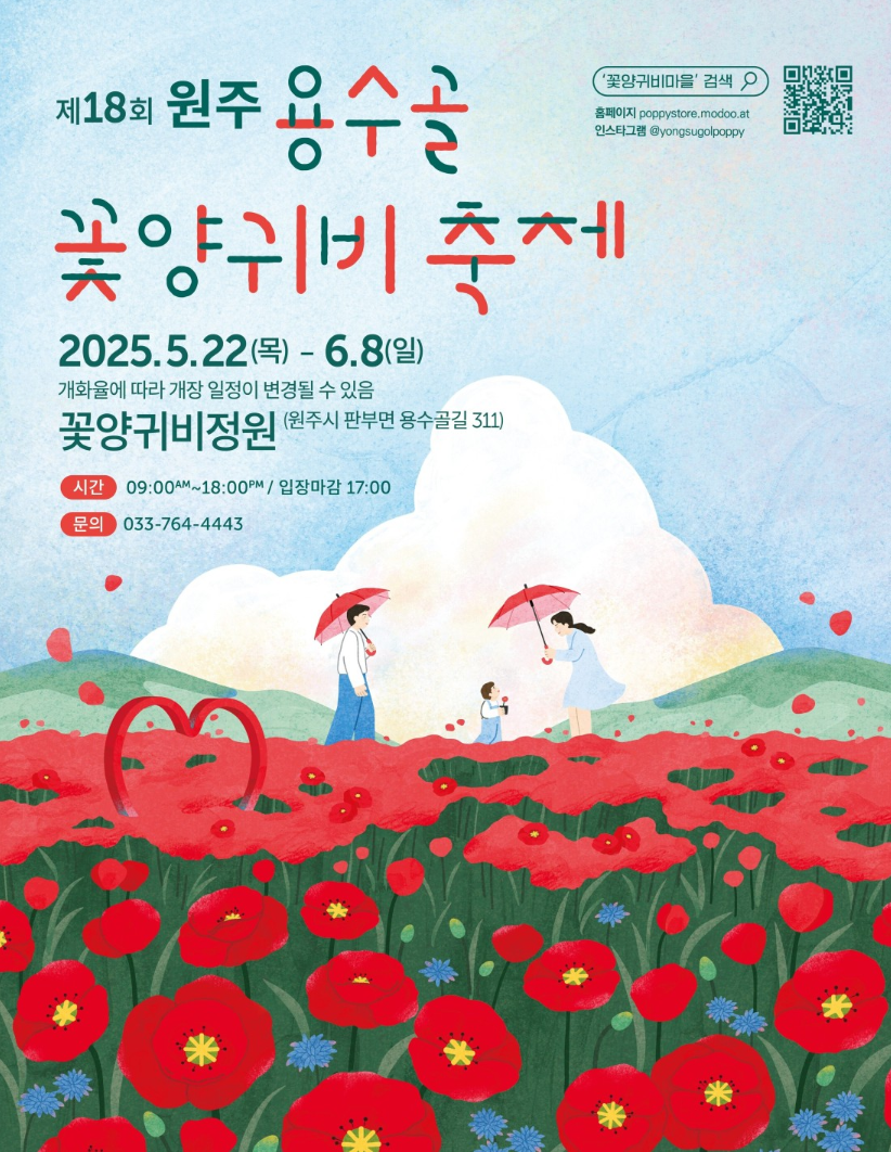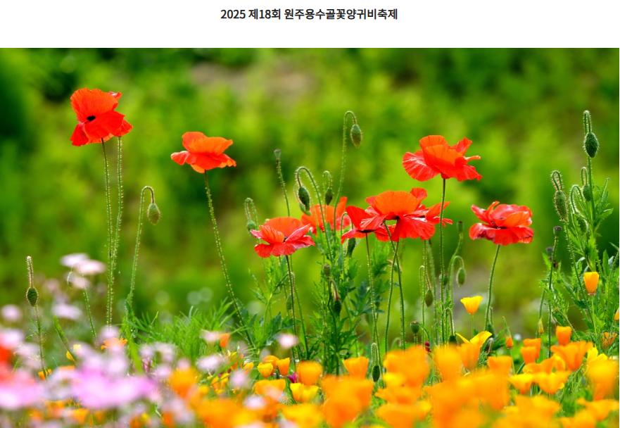 강원도 원주 용수골에서 펼쳐지는 '제18회 원주 용수골 꽃양귀비축제'가 2025년 5월 22일부터 6월 8일까지 18일간 개최됩니다. 이 축제는 매년 5월 말부터 6월 초까지 용수골 꽃양귀비정원에서 열리며, 붉은 꽃양귀비가 만개하는 시기에 맞춰 방문객들에게 아름다운 자연경관과 다양한 체험 프로그램을 제공합니다.
