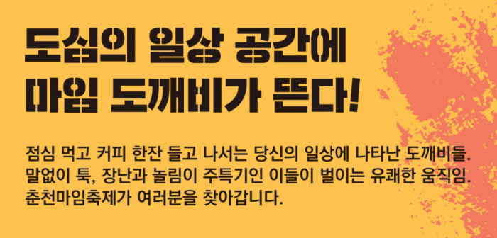 춘천마임축제 프로그램, 공연 일정, 장소 안내 등은 공식 홈페이지(www.mimefestival.com) 및 SNS 채널(인스타그램, 페이스북)을 통해 확인할 수 있으며, 실시간 공지사항과 변경 안내도 함께 제공됩니다.