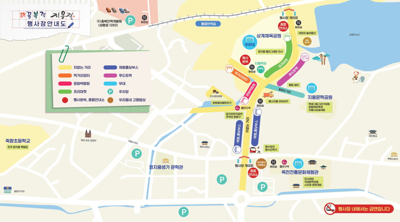 현장에서는 종합 안내소와 QR 코드 스캔을 통해 모바일 가이드북도 제공되며, 참여 신청 확인은 접수증 출력 또는 모바일 바코드 제시로 진행됩니다. 백일장, 시낭송대회 등은 접수 확인 문자로 본인 확인이 가능하며, 수상 결과 발표도 홈페이지에서 확인할 수 있습니다.