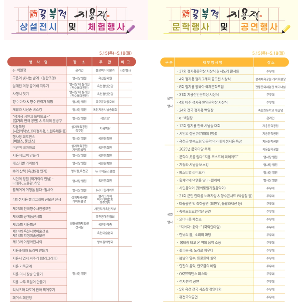 지용제 공식 홈페이지(gy-festival.okcc.or.kr)에서는 전체 프로그램 일정, 백일장 신청 방법, 공연 라인업, 오시는 길 등을 상세히 안내하고 있습니다. 또한 실시간 공지사항과 날씨에 따른 일정 변동도 확인 가능합니다.