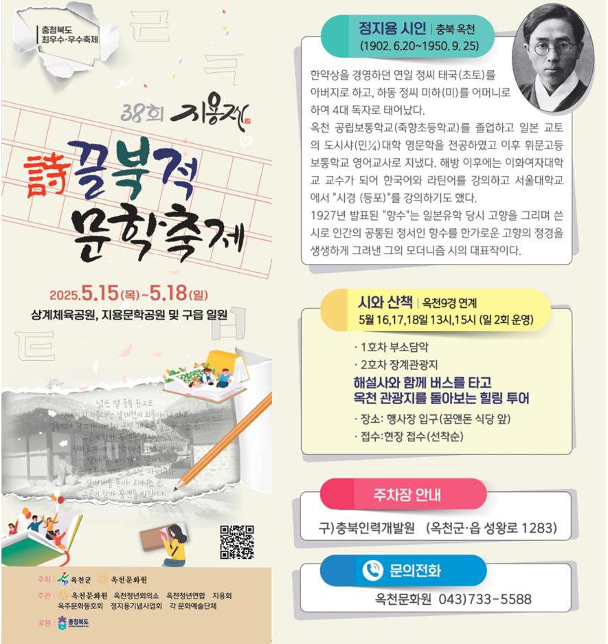한국 현대시의 선구자 정지용 시인을 기리는 문학축제, 지용제가 2025년 5월 15일부터 18일까지 충청북도 옥천군에서 개최됩니다. '詩끌 북적 문학축제'라는 슬로건 아래, 정지용 시인의 고향에서 그의 문학 세계를 체험할 수 있는 다양한 프로그램이 마련되어 있습니다. 문학을 사랑하는 이들에게는 물론, 가족 단위 관람객에게도 특별한 추억을 선사할 이번 축제에 많은 관심과 참여 바랍니다.