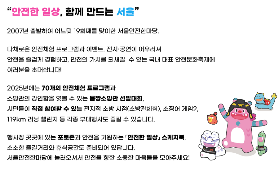 2025년 5월 1일부터 3일까지, 서울시 소방재난본부 주최로 여의도공원 문화의 마당에서 '2025 서울안전한마당'이 개최됩니다. 이 행사는 서울시민들에게 다양한 재난 상황에 대한 체험 기회를 제공하여 일상 속에서 안전의식을 높이는 데 목적이 있습니다. 가족 단위 방문객과 어린이를 위한 맞춤형 프로그램도 풍부하게 준비되어 있어 봄나들이 겸 유익한 시간을 보낼 수 있는 최적의 행사입니다.