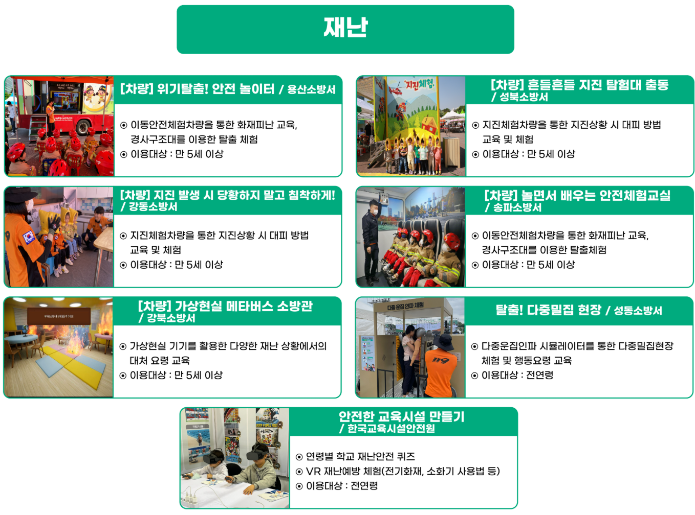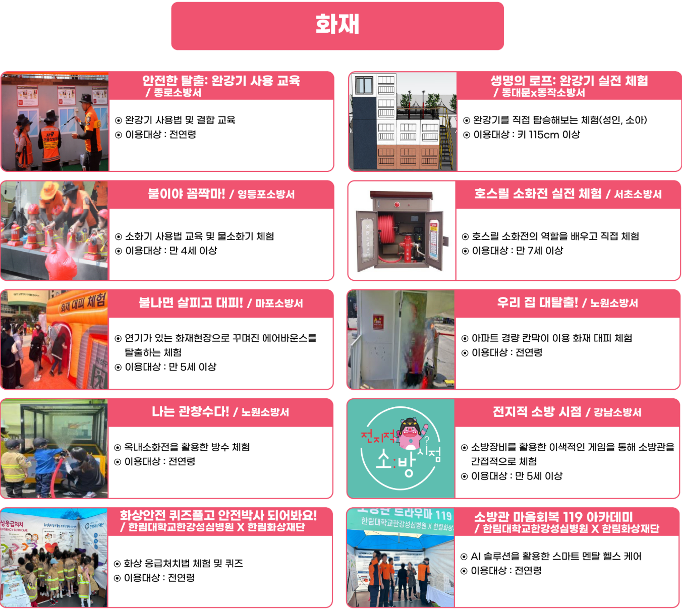 | 어린이 | 보호자 동반 권장 | 소방차 탑승, 지진 체험관, 퀴즈 이벤트 |