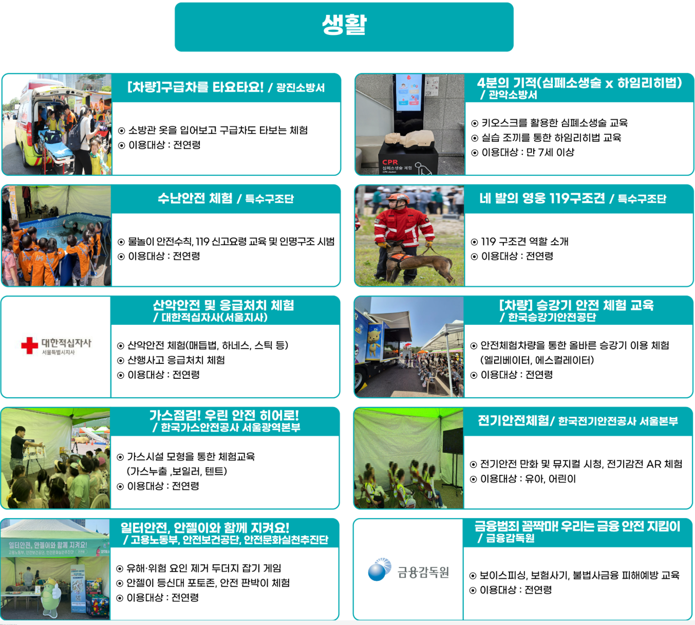 | 청소년 | 개별 또는 단체 참여 | 심폐소생술 실습, 안전 골든벨 |