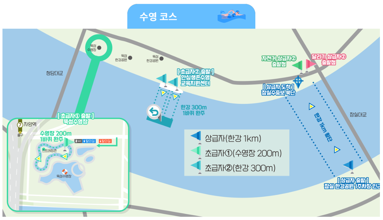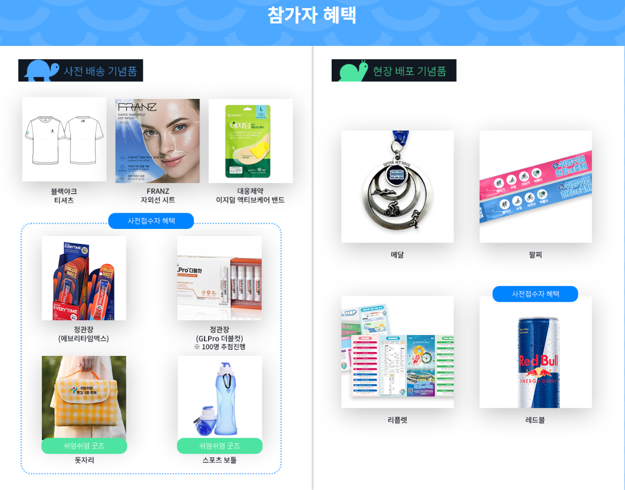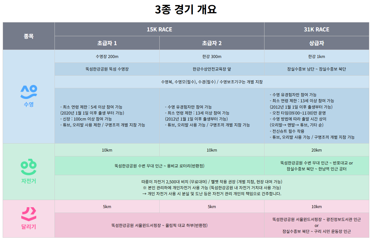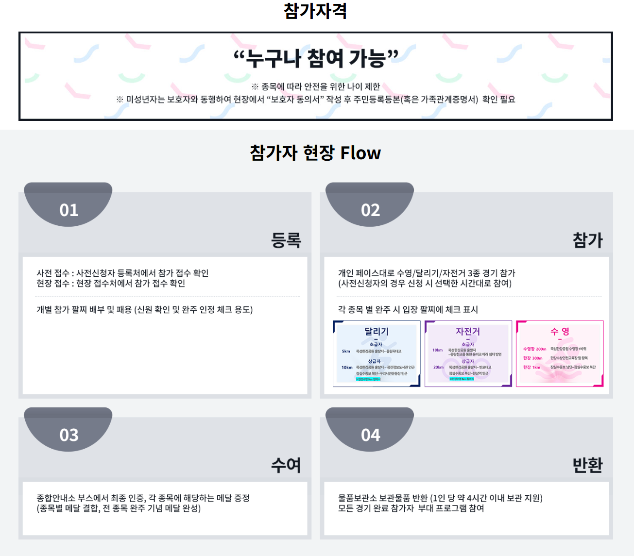 행사장에는 주차 공간이 제한되어 있으므로, 대중교통 이용을 권장합니다. 또한 3종 경기 참가자는 탈의실과 샤워실 등 편의 시설을 사전 확인하세요. 기념품은 사전 예약자를 대상으로 현장에서 수령 가능합니다.