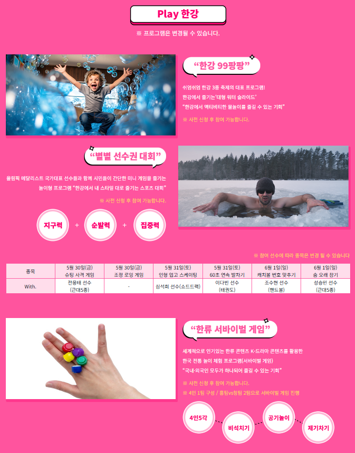 한강을 배경으로 펼쳐지는 3종 스포츠 축제로, 카약, 패들 보드, 챌린지 러닝 등 다양한 액티비티를 직접 체험할 수 있는 행사입니다. 단순한 스포츠 축제를 넘어, 소상공인 참여형 푸드존, 음악 공연, 체험 부스 등도 함께 마련되어 있어 온 가족이 함께 즐기기 좋습니다.