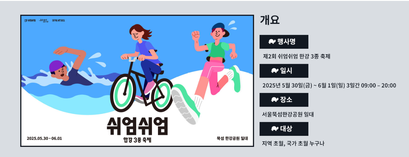 서울 한강에서 단 3일 간만 펼쳐지는 특별한 축제, ‘쉬엄쉬엄 한강 3종 축제’가 돌아왔습니다. 뚝섬한강공원을 무대로 즐기는 수상 스포츠와 이색 체험 프로그램, 지역 소상공인의 음식까지 한 자리에서 누릴 수 있는 기회, 절대 놓치지 마세요!