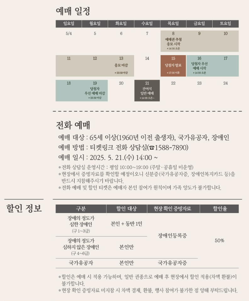 장애인, 국가유공자, 고령자(65세 이상)는 전화 예매 및 50% 할인 혜택이 제공됩니다. 증빙자료 필수 지참!