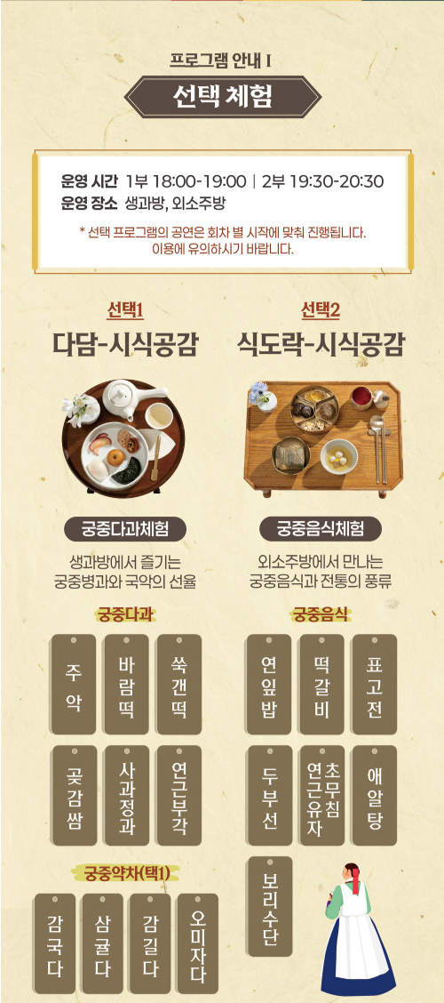A. 궁중병과(주악, 떡, 정과 등) 또는 연잎밥 중심의 정식(떡갈비, 어알탕 등) 중 선택 가능합니다.