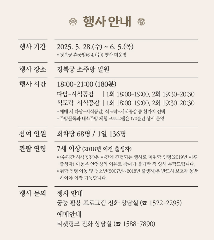 ‘2025 수라간 시식공감’은 경복궁 소주방에서 펼쳐지는 전통문화 복합체험 행사로, 단순한 식사가 아닌 오감이 깨어나는 시간입니다.