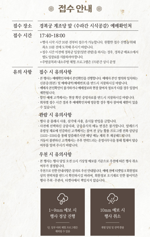10mm 이상 강수 예보 시 행사 전면 취소되며, 전액 환불됩니다.