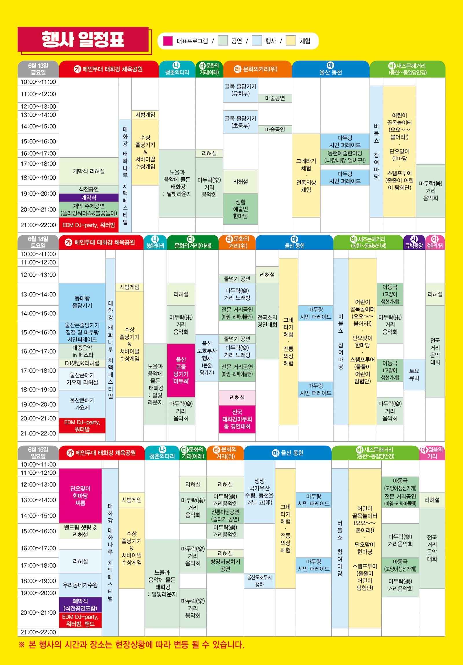 | 주요 프로그램 | 줄당기기, 체험부스, 공연, 캐릭터 퍼레이드 |