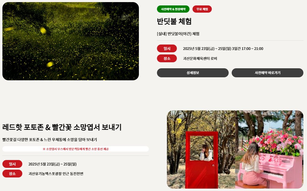 | 빨간꽃길 괴산 걷기 대회 | 축제 장소를 따라 조성된 꽃길을 걷는 걷기 챌린지, 기념품 제공 |