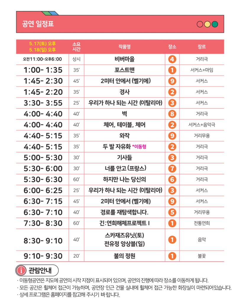 | 일반 관람객 | 제한 없음 | 모든 공연 및 프로그램 무료 관람 |