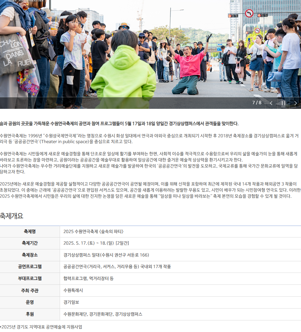 또한, 축제 관련 공지사항이나 변경 사항은 수원연극축제 공식 인스타그램(@suwon_festival)에서도 실시간으로 업데이트되므로, 방문 전 최신 정보를 확인하시기 바랍니다.