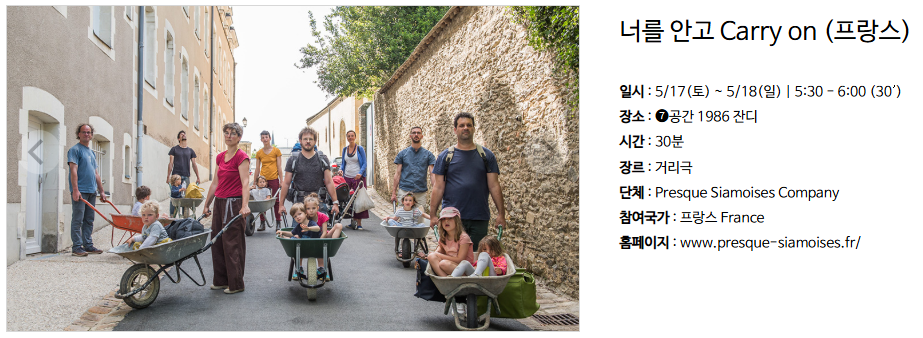 A2. 네, 있습니다. 특히, 프랑스 초청작 '너를 안고(Carry-on)'은 부모와 자녀가 함께 참여하는 시민 참여형 공연으로, 사전에 모집된 가족들이 함께 무대에 오릅니다. 또한, 어린이와 청소년을 위한 다양한 체험 프로그램도 마련되어 있어 가족 단위의 방문객에게 적합합니다.