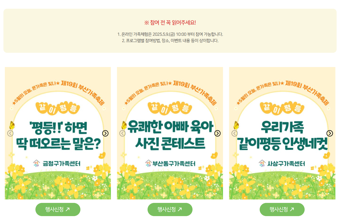 자세한 신청 방법과 프로그램 일정은 부산가족축제 공식 홈페이지에서 확인하실 수 있습니다. 또한, 부산지역 건강가정지원센터 및 가족센터(☎1577-9337)로 문의하시면 자세한 안내를 받으실 수 있습니다.