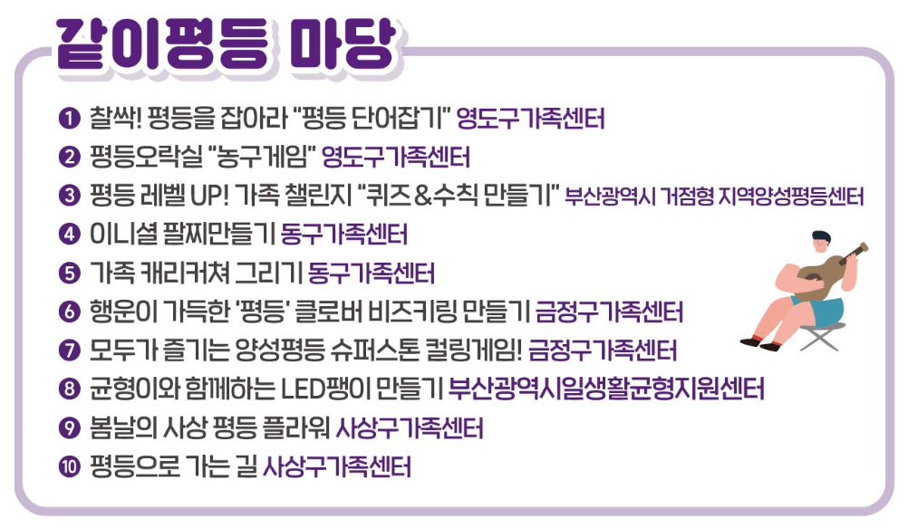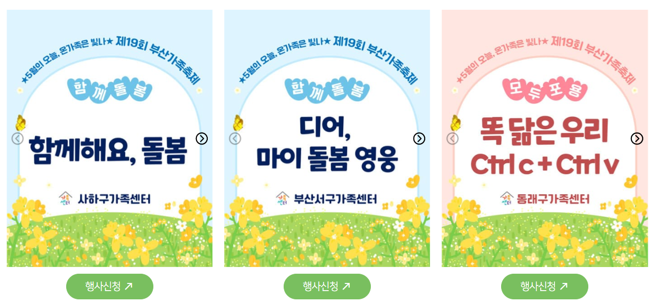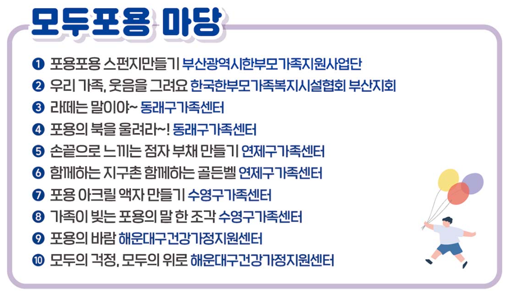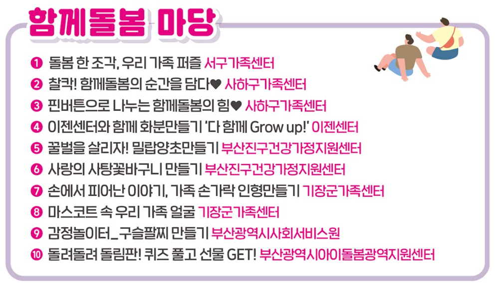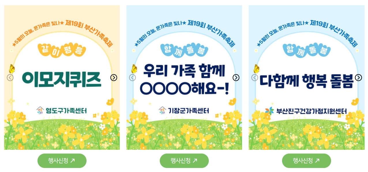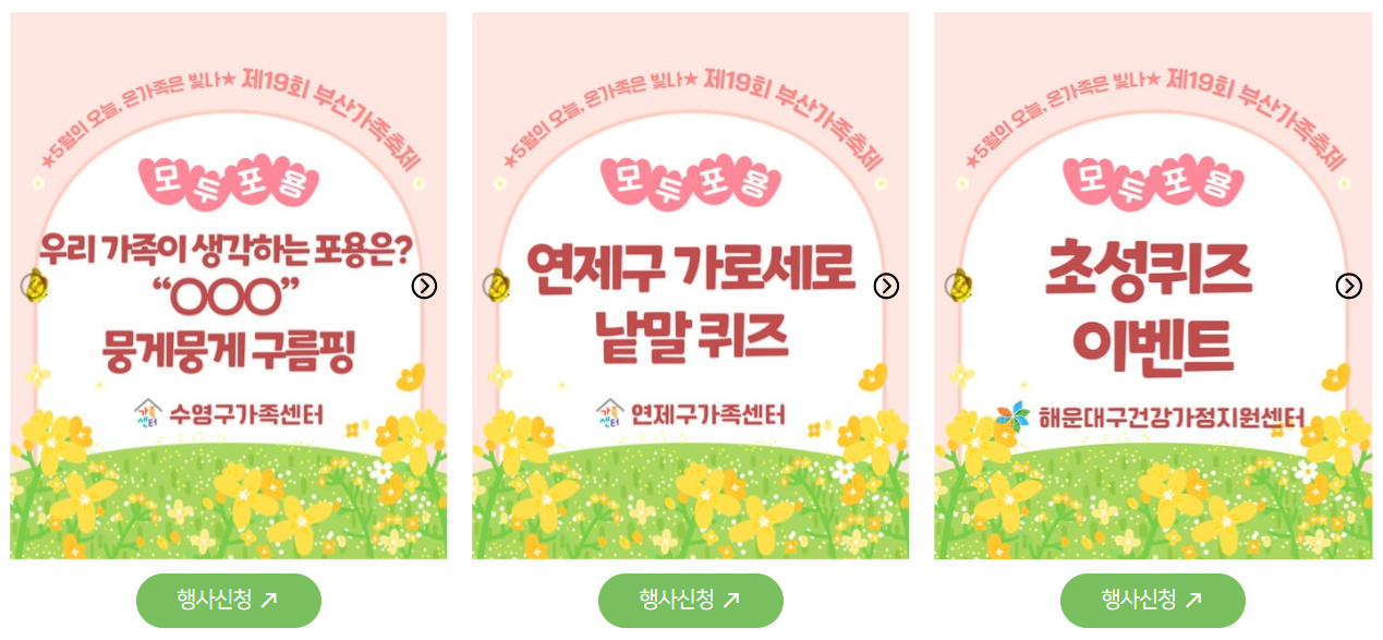 또한, 부산지역 건강가정지원센터 및 가족센터(☎1577-9337)로 문의하시면 자세한 안내를 받으실 수 있습니다. 현장에서는 안내 부스를 통해 프로그램 참여 방법과 일정 등을 확인할 수 있습니다.