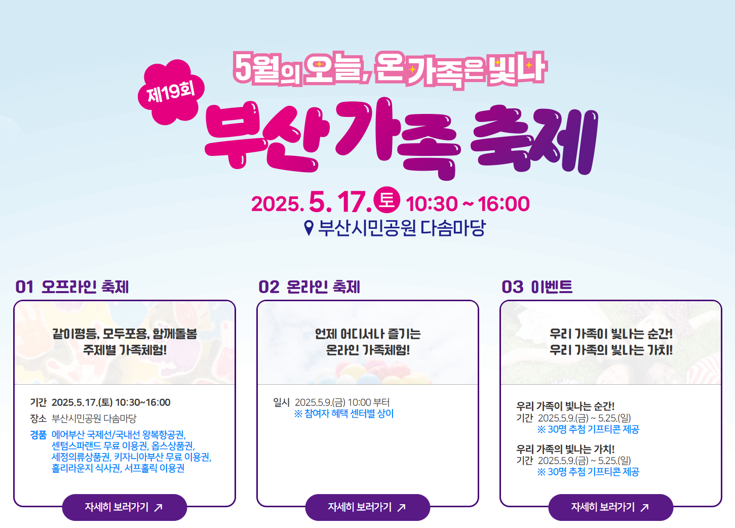 제19회 부산가족축제는 2025년 5월 17일(토) 오전 10시 30분부터 오후 4시까지 부산시민공원 다솜마당에서 오프라인으로 진행됩니다. 온라인 축제는 5월 9일(금)부터 5월 25일(일)까지 공식 홈페이지를 통해 참여할 수 있습니다.