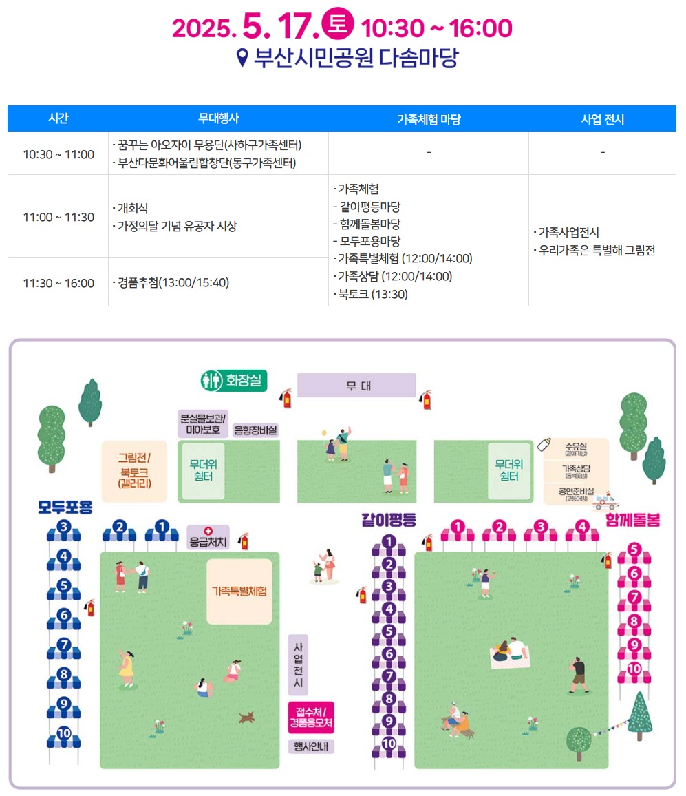 부산가족축제는 오프라인과 온라인으로 동시에 진행됩니다. 오프라인 행사는 2025년 5월 17일(토) 오전 10시 30분부터 오후 4시까지 부산시민공원 다솜마당에서 열리며, 온라인 행사는 5월 9일(금)부터 5월 25일(일)까지 공식 홈페이지를 통해 참여할 수 있습니다.