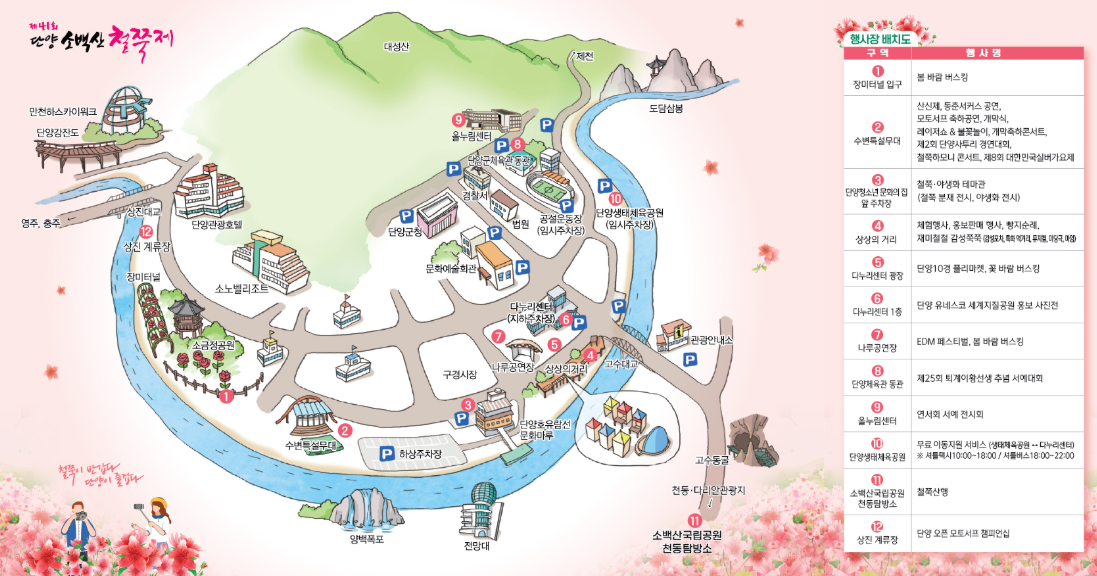 A. 주요 행사장은 단양읍 상상의거리 일대이며, 소백산 등산로 주변에서도 자연 체험형 프로그램이 진행됩니다. 행사장 간 이동은 도보 또는 셔틀버스를 통해 가능합니다.