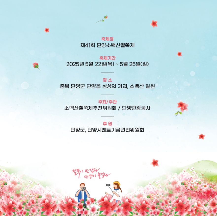 충북 단양의 대표 봄 축제인 '제41회 단양 소백산 철쭉제'가 2025년 5월 22일부터 25일까지 4일간 개최됩니다. 소백산의 철쭉이 만개하는 시기에 맞춰 진행되는 이번 축제는 상상의거리와 소백산 일원에서 다양한 프로그램으로 방문객을 맞이할 예정입니다. 자연의 아름다움과 함께하는 축제의 현장으로 여러분을 초대합니다.